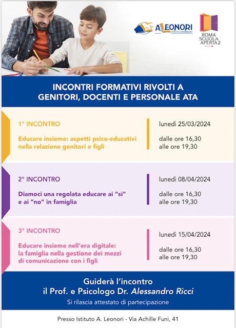 I tre incontri si svolgeranno in presenza presso l’auditorium della dell’IC A. Leonori – via Funi 41.